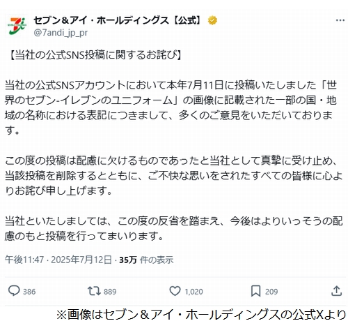 2025/07/13 03:08 Written by ナリナリ編集部セブン&アイ・ホールディングスは7月12日、公式X(Twitter)を更新し、「世界のセブン-イレブンのユニフォーム」を紹介する画像に「中国(台湾)」と表記していたことについて謝罪した。