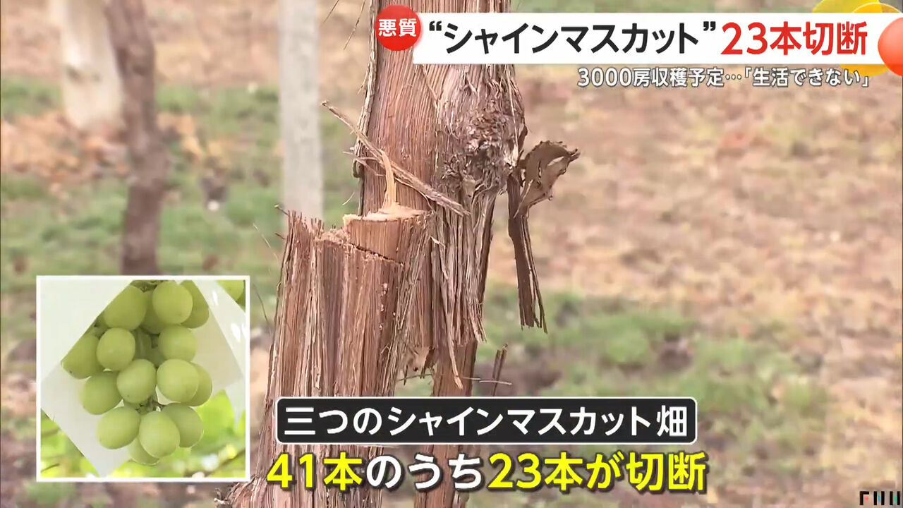 3つのシャインマスカット畑の41本のうち、23本が切断されました。