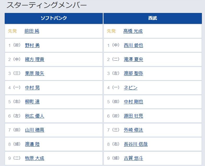 【ソフトバンク対西武12回戦】4(一) 中村 晃 6(左) 秋広 優人 7(指) 山川 穂高