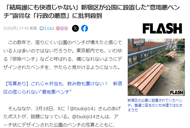 新宿区が公園に設置した“意地悪ベンチ”露骨な「行政の悪意」に批判刹到