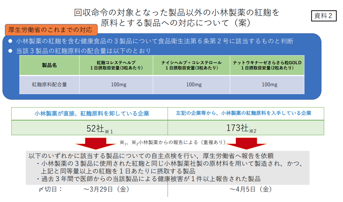 厚労省が28日の専門家会議に示した資料によると、小林製薬は紅こうじ原料を52事業者に卸しており、さらに卸などを通じて173事業者が供給を受けているとしている。173事業者に対し厚労省は、「過去3年間に医師から健康被害の報告があった」かどうかなどについて事業者が自主点検した上で、4月5日までに報告するよう求める。