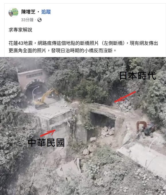 【花蓮共同】台湾東部沖地震で大きな被害が出た花蓮県の山間部で、日本の植民地統治下で建設された古い橋が崩落を免れた一方、隣接している比較的新しい橋が崩れ落ちたと、台湾紙の自由時報(電子版)が5日までに伝えた。インターネット上では、長さなどが異なるため単純に比較できないとの意見もあるが、頑丈さに驚く声も上がっている。