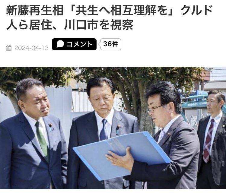 新藤義孝経済再生担当相は13日、地元の埼玉県川口市で少数民族クルド人ら外国籍住民が多く住む地域を視察した。その後、仮放免者や一部外国人の迷惑行為への対応について市側と意見交換し「外国人と共生するための相互理解を充実させていく必要がある」と述べた。