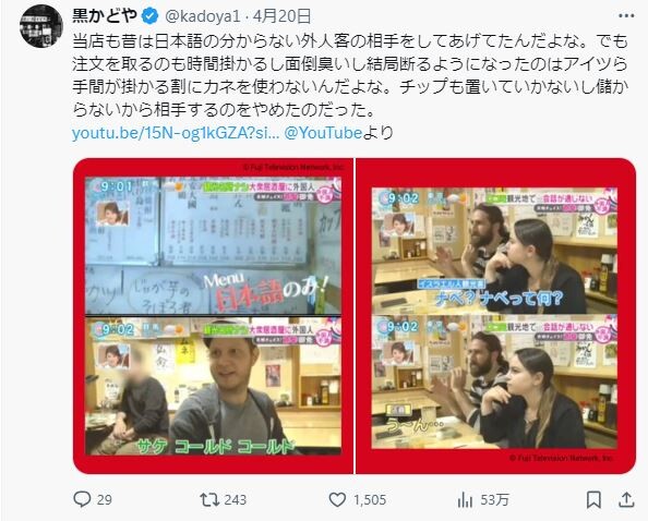 「昨日は白人のカップルが入店してきたから『日本語が分からないと対応できない』と伝えたらポカンとして『no english menu?』と英語で聞いてきたから『ない』と日本語で答えてやった。ここは日本だ。俺も英語の国に行ったら英語を喋る。日本では日本語を喋る努力をしろ。無理なら通訳を連れて来い」と投稿。