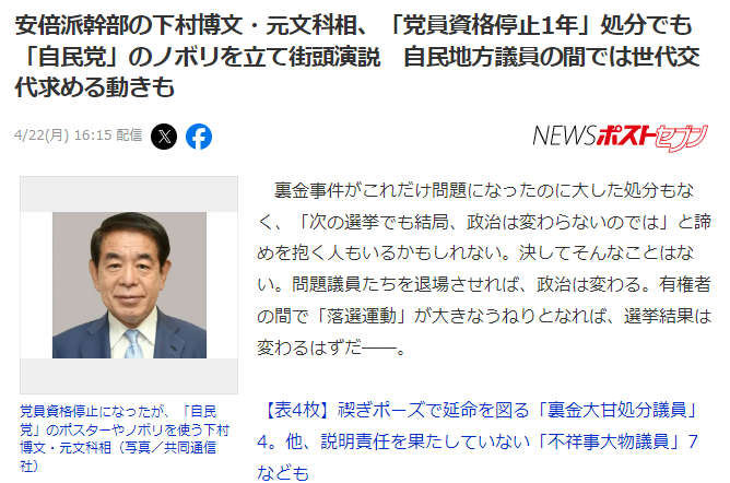 【悲報】党員資格停止1年処分を受けた下村博文・元文科相、お詫び行脚をするも「自民党」のノボリを立て街頭演説