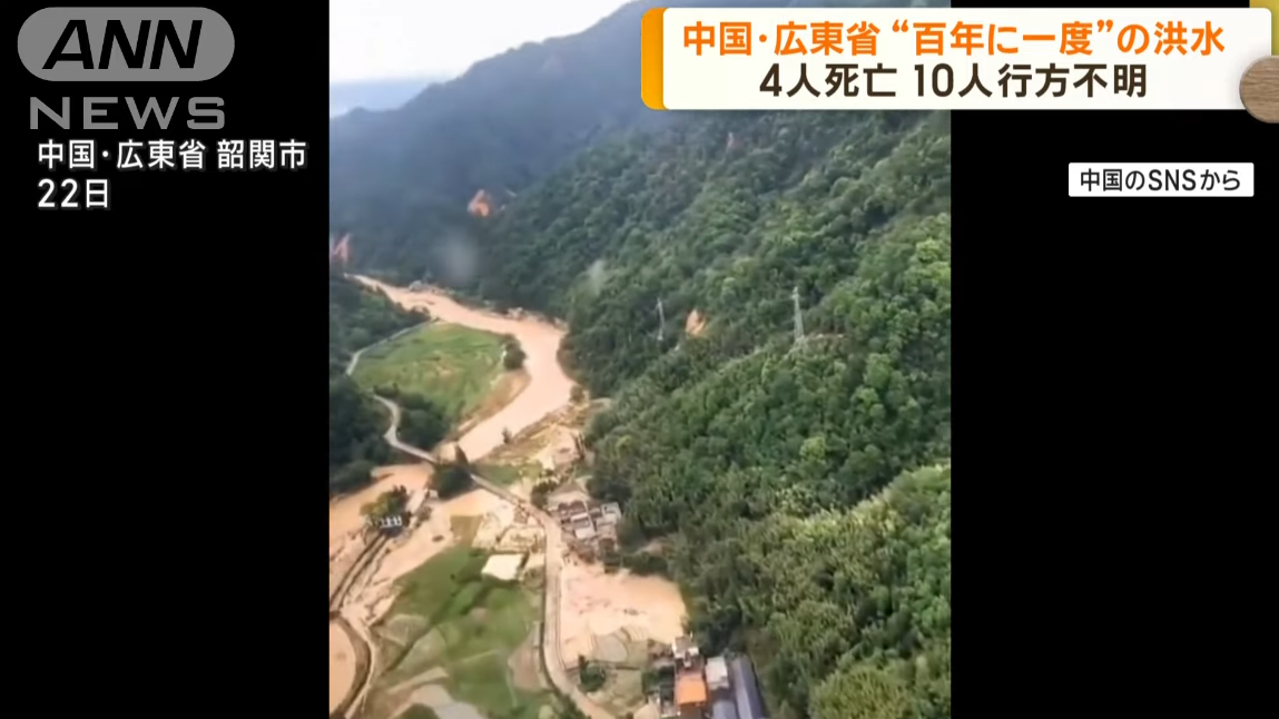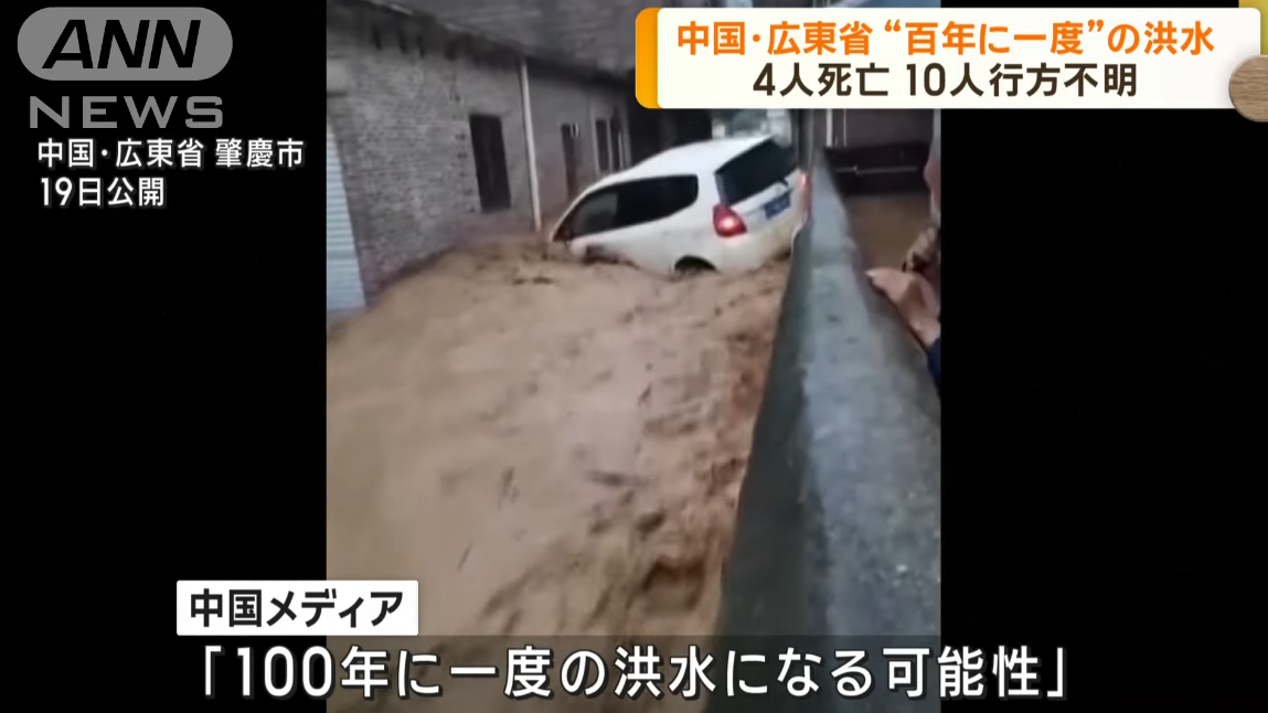 中国・広東省で降り続いた雨で洪水が発生し、これまでに4人が死亡し10人が行方不明になっています。山肌が露出し、街が茶色の濁流にのみ込まれています。