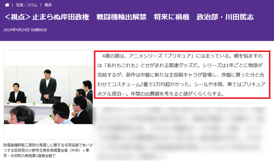 東京新聞、暴走する岸田政権と批判する為に『娘のプリキュアグッズ事情』を防衛費に例えて記事にするも・・・
