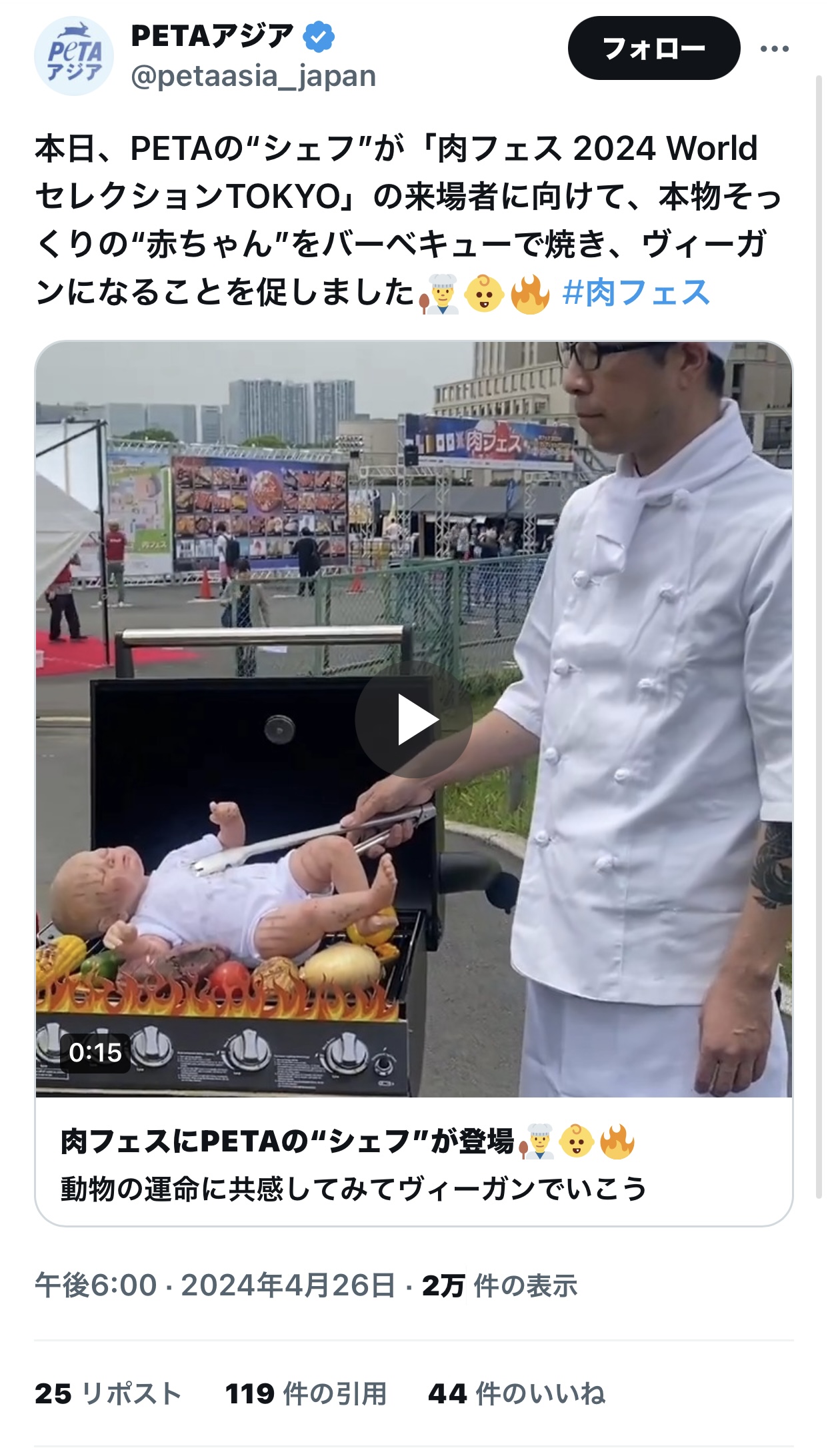 本日、PETAの“シェフ”が「肉フェス 2024 World セレクションTOKYO」の来場者に向けて、本物そっくりの“赤ちゃん”をバーベキューで焼き、ヴィーガンになることを促しました👨‍🍳👶🔥 #肉フェス