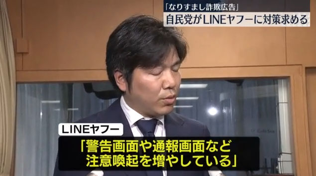 有名人の名前や顔写真を無断で使用し投資などを呼び掛けるニセ広告による詐欺被害が相次ぐ中、自民党は25日、LINEヤフーの幹部からヒアリングを行い、この席で平井元デジタル相は、悪質な広告の掲載を規制する法改正も視野に、対策を強化する方針を示した。