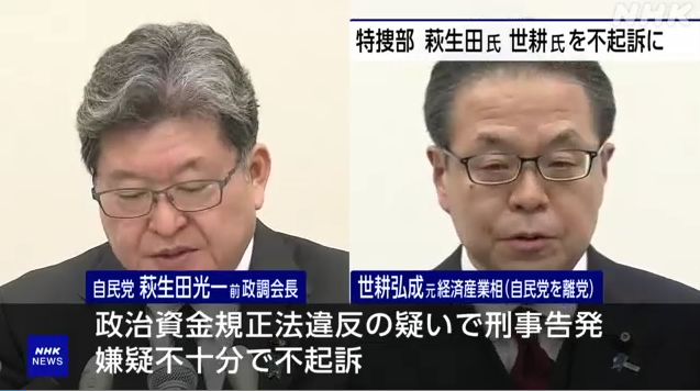 【速報】東京地検特捜部 萩生田氏と世耕氏 嫌疑不十分で不起訴