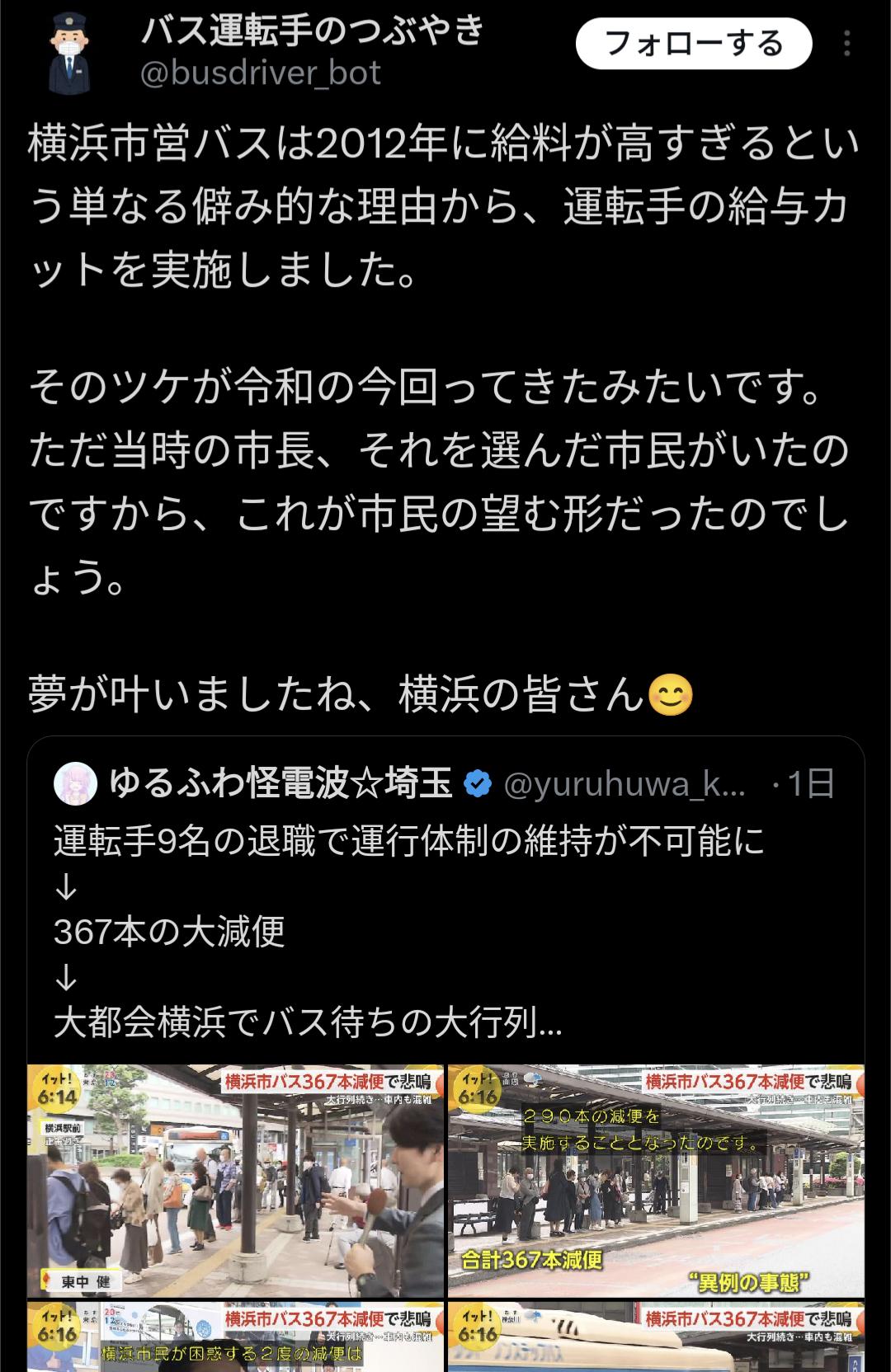 横浜市民「市バスの運転手の給料高すぎ!減額しろ!!!」→運転手不足でバス消滅