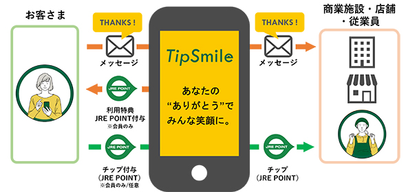 JR東日本は、2023年10月よりトライアルサービスを行っている「TipSmile(チップスマイル)」の本サービスを、6月1日より提供すると発表した。本サービスでは顧客が従業員や店舗に対して、感謝のメッセージを伝えるだけでなく、JRE POINTをチップとして送ることが可能だ。