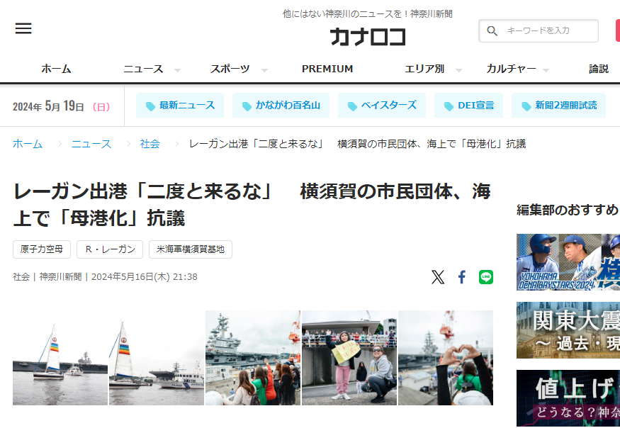 米海軍横須賀基地(神奈川県横須賀市)に配備されていた原子力空母「ロナルド・レーガン」が米本国へ向けて出港した16日、市民団体「ヨコスカ平和船団」はボートとヨットを出し、海上から横須賀の原子力空母の母港化が続くことに反対する姿勢を示した。