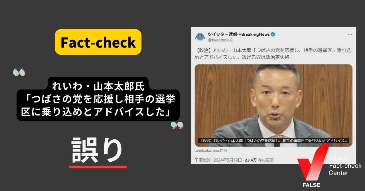 日本ファクトチェックセンター 「れいわ新選組、山本太郎氏がつばさの党を応援し、相手の選挙区に乗り込めとアドバイス」は誤り