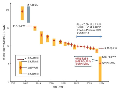 太陽光発電が国内最安の電源に、供給価格が4円/kWh台まで低下
