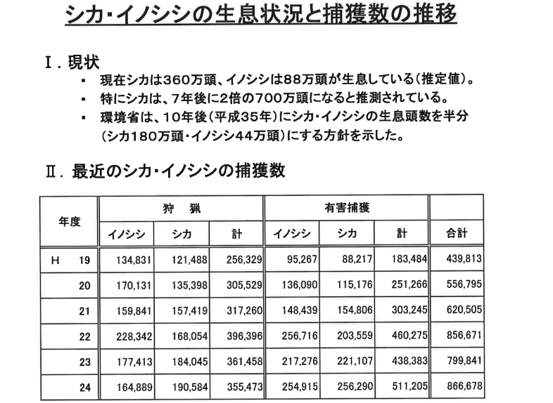 特にシカは、7年後に2倍の700万頭になると推測されている。環境省は、10年後にシカ・イノシシの生息頭数を半分