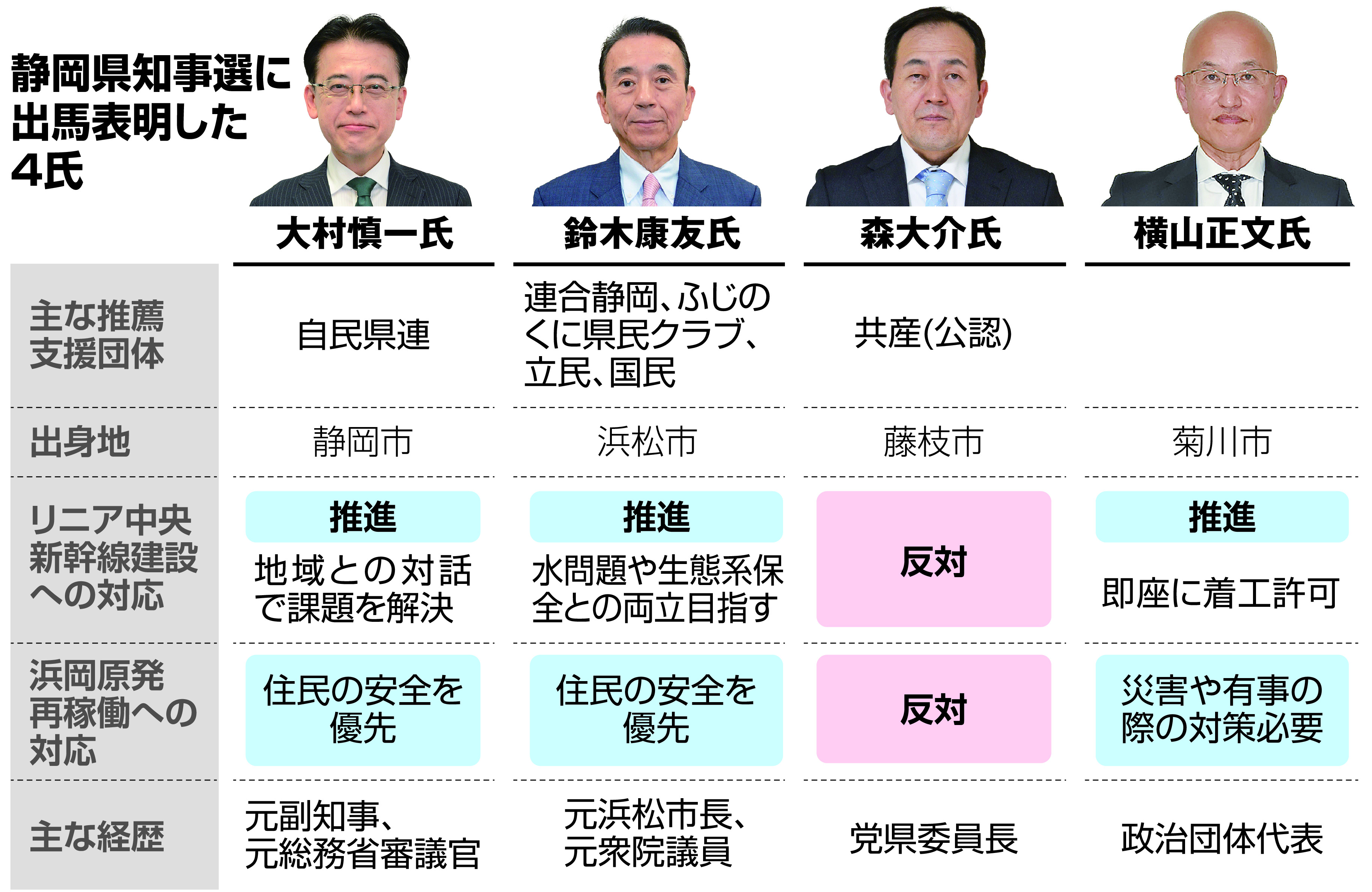 26日投開票の静岡県知事選は、無所属新人で前浜松市長の鈴木康友氏(66)=立憲民主、国民民主推薦=が、元副知事の大村慎一氏(60)=自民推薦=ら新人5人を破り初当選を確実にした。