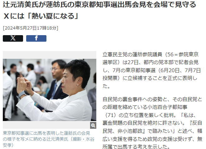 辻元氏は、蓮舫氏の会見が始まる前、自身のX(旧ツイッター)を更新し「まもなく、蓮舫さんが、都知事選挙に向けた、思いを語ります。仲間として、そして、かけがえのない友として、蓮舫さんの決断に心から敬意」と投稿。「東京だけではなく、日本の政治の流れを変える勇断。一緒に、ゴールに向けて走り切りたい。熱い夏になる」ともポスト。都知事選での連携を明らかにしている。