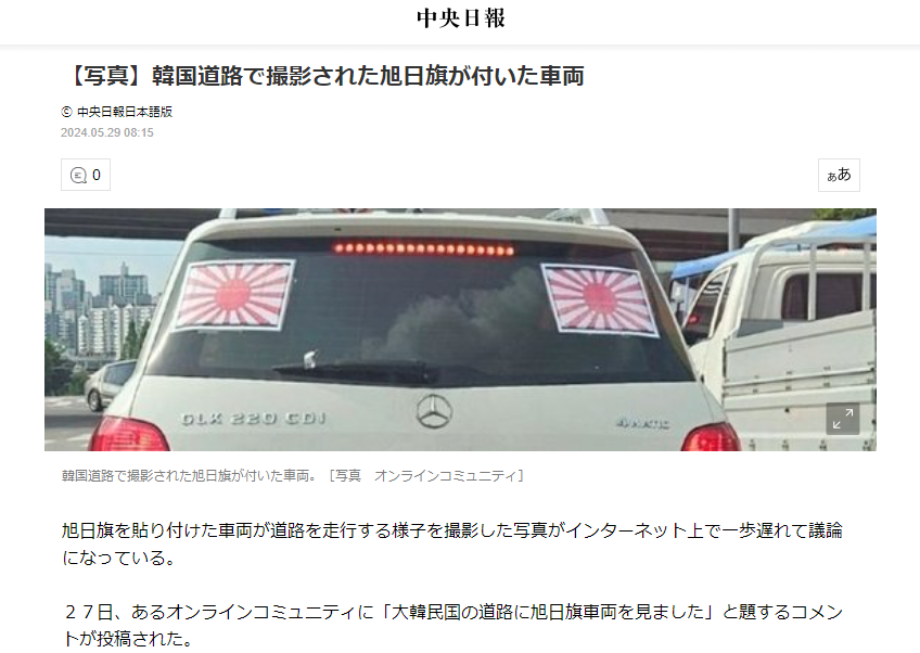 2024.05.29 08:00旭日旗を貼り付けた車両が道路を走行する様子を撮影した写真がインターネット上で一歩遅れて議論になっている。