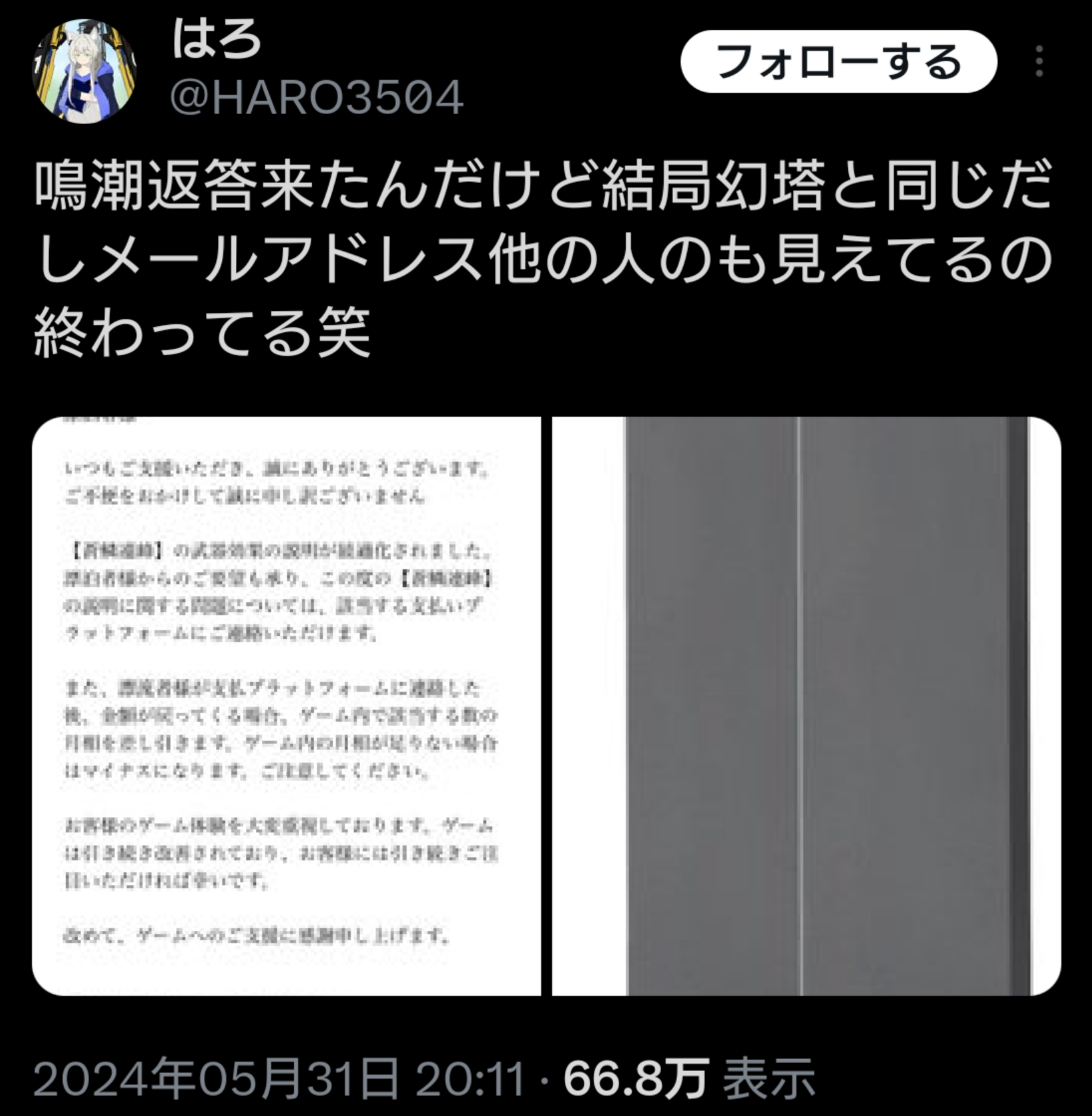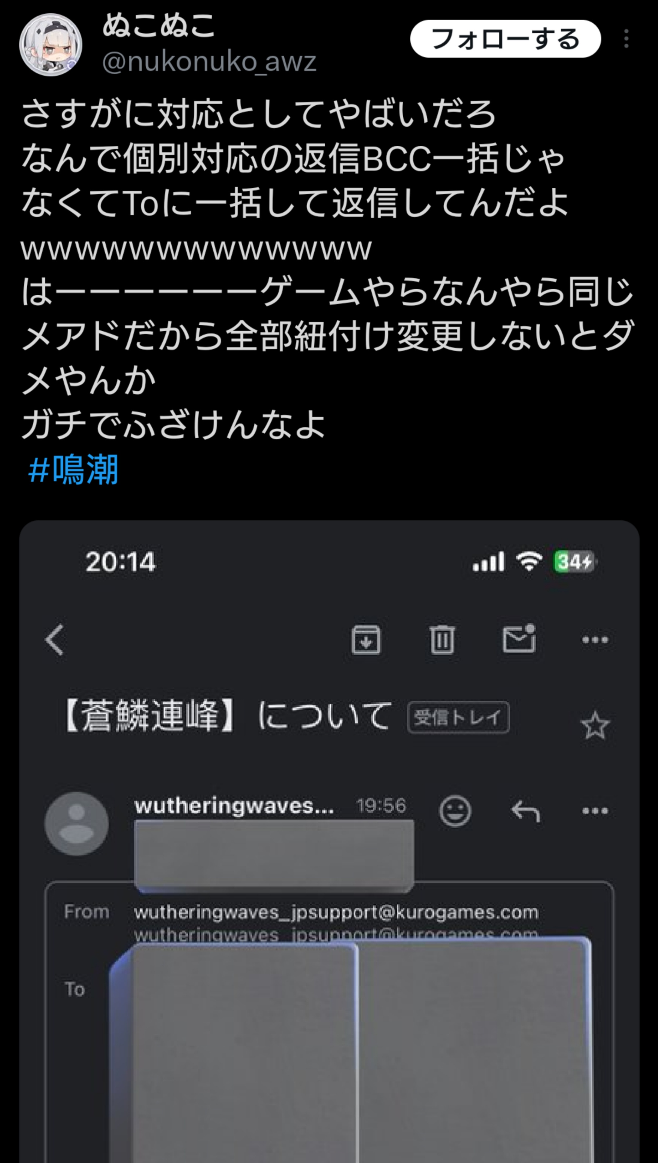 【速報】『原神』を超えると話題の中国産ゲーム『鳴潮』問い合わせユーザーのメアドを晒して無事死亡www