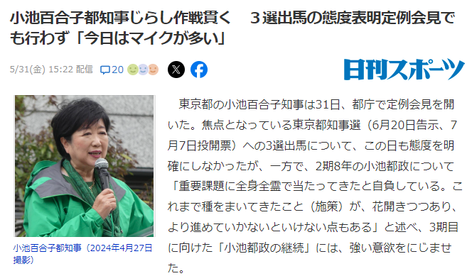 百合子のじらし作戦「今日はマイクが多いわね、ではご機嫌よう」まだ出馬表明なし
