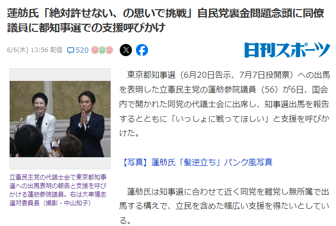 蓮舫氏は知事選に合わせて近く同党を離党し無所属で出馬する構えで、立民を含めた幅広い支援を得たいとしている。