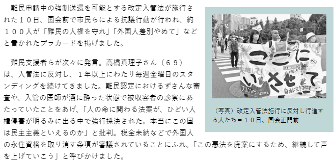 https://www.jcp.or.jp/akahata/aik24/2024-06-11/2024061113_01_0.html参加者は抗議行動後に行進し、国会周辺各所から「強制送還は人権侵害だ」「入管職員は暴力やめろ」などと声を響かせました。車からクラクションを鳴らしたり、ガッツポーズをしたりして連帯を示す通行人の姿もありました。