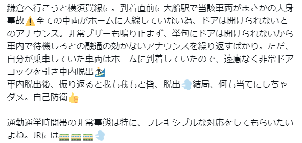 鎌倉へ行こうと横須賀線に。到着直前に大船駅で当該車両がまさかの人身事故⚠️全ての車両がホームに入線していない為、ドアは開けられないとのアナウンス。非常ブザーも鳴り止まず、挙句にドアは開けられないから車内で待機しろとの融通の効かないアナウンスを繰り返すばかり。ただ、自分が乗車していた… pic.twitter.com/1Zwj5eoFwL