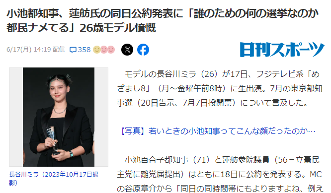 モデルの長谷川ミラ(26)が17日、フジテレビ系「めざまし8」(月~金曜午前8時)に生出演。7月の東京都知事選(20日告示、7月7日投開票)について言及した。小池百合子都知事(71)と蓮舫参院議員(56=立憲民主党に離党届提出)はともに18日に公約を発表する。MCの谷原章介から「同日の同時間帯にもよりますよね、例えば昼ぐらいに片方が公約を発表したら、ちょっと数時間ずらして」と話を振られると、長谷川は「ホントにやめません? そういうの。誰のための何の選挙なのか。ものすごく、都民をナメてるんだなって」とコメントした。