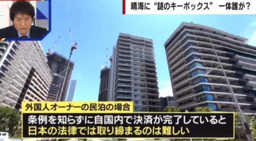 中央区のタワマン周りの電柱などに鍵付きBOXがありこれは中国人🇨🇳による民泊事業の可能性が高い。湾岸エリアは基本民泊の許可が降りないが外国人オーナーの場合は条例を知らずに自国内で予約・決済を完了させるから日本の法律では取り締まれない。