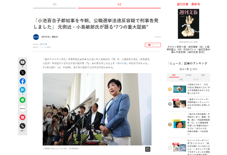 【速報】小池百合子、公選法違反で刑事告発