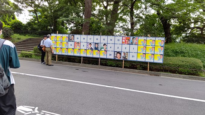東京都知事選。候補者56人。ロロポスターを貼った候補も。N党のポスター枠売り出しでは、ヘイトポスターや詐欺商法のポスターが発見される。とんでもない状態。写真は法政大学正門前のポスター掲示板。