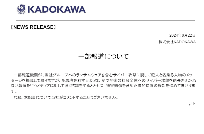 【悲報】KADOKAEAは報道に強く抗議「犯行グループに未承認の身代金支払い→騙され追加要求」と報じれる→個人情報が段階的に開示される祭りに突入か