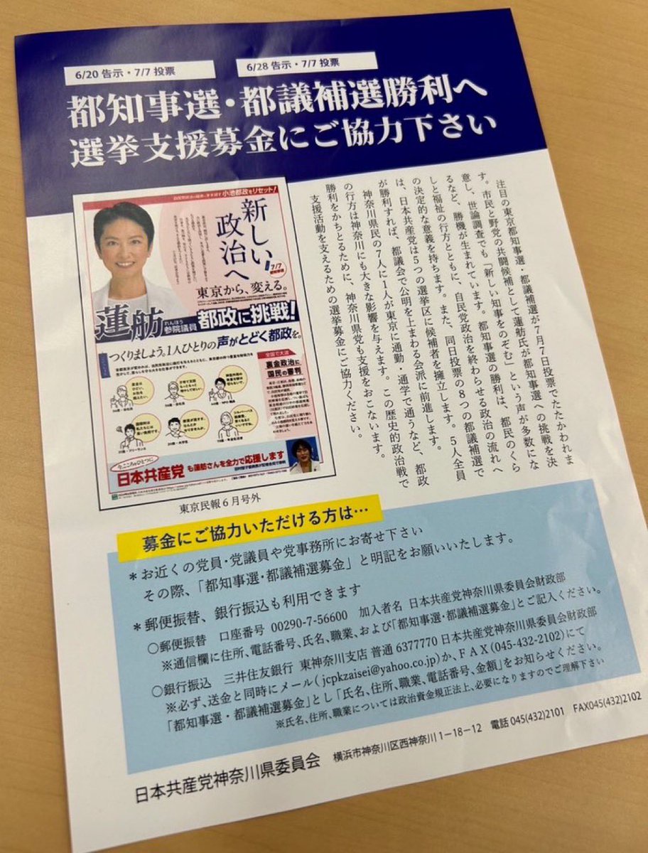 【速報】蓮舫チラシ、日本共産党神奈川県委員会も作製「都知事選・都議補選勝利へ募金にご協力下さい」