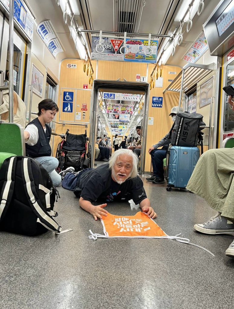 【画像】韓国でも有名な極悪障害者団体「全障連」、日本上陸!地下鉄で好き放題暴れている模様