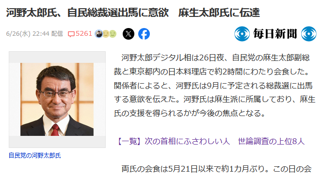 河野太郎デジタル相は26日夜、麻生太郎副総裁と東京都内の日本料理店で約2時間にわたり会食した。関係者によると、河野氏は9月に予定される総裁選に出馬する意欲を伝えた。河野氏は麻生派に所属しており、麻生氏の支援を得られるかが今後の焦点となる。