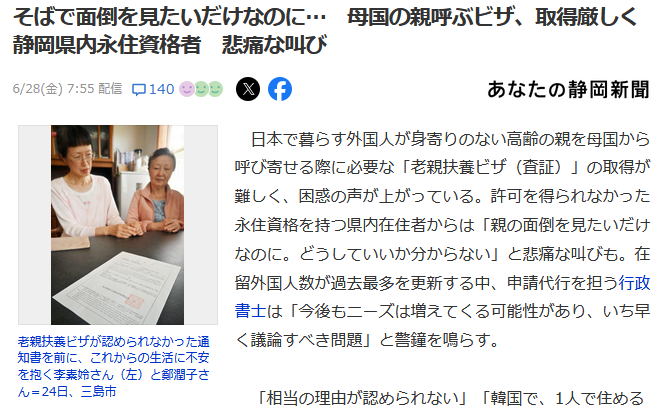 在日韓国人、韓国の家を失った母(不安症・うつ病・高血圧・糖尿病持ち)を日本に呼び寄せ→入管「在留資格の不許可、来月帰国ね」在日「親の面倒を見たいだけなのに何故!?」