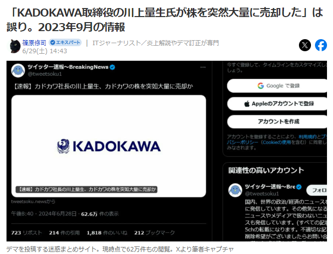 5ちゃんねるにスレ立て→ツイッター速報が拡散サイバー攻撃を受けている株式会社KADOKAWAの取締役の川上量生氏、このタイミングで同社の株を大量に売却していたことが分かったとする言説が拡散していますが、デマです。
