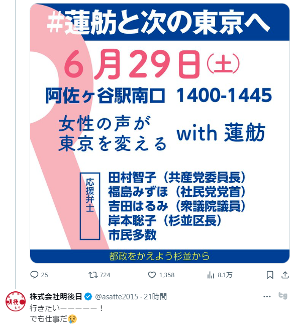 共産党「蓮舫さんの公約には共産党の提案が生かされています」