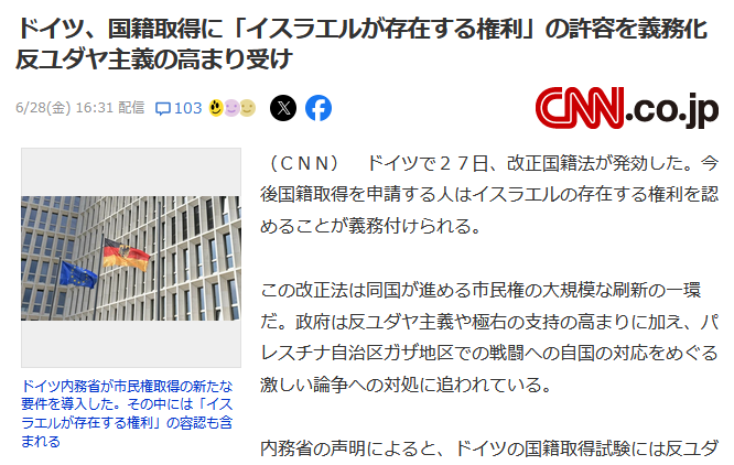 【速報】ドイツで改正国籍法が発効「今後国籍取得にはイスラエルの存在を認めることを義務化」