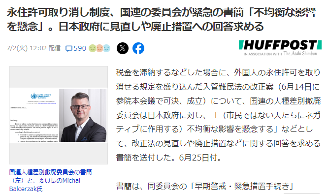 永住許可取り消し制度、国連の委員会が緊急の書簡「不均衡な影響を懸念」。日本政府に見直しや廃止措置への回答求める