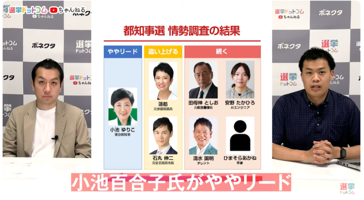 https://go2senkyo.com/articles/2024/07/03/97533.html選挙ドットコム編集長の鈴木邦和と選挙ドットコム編集部で情勢調査を担当する中山智貴が、6月28日(金)から30日(日)の3日間に実施された東京都知事選の情勢調査の結果について、細かくお伝えします。