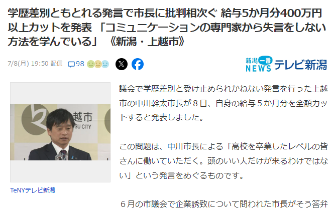 議会で学歴差別と受け止められかねない発言を行った上越市の中川幹太市長が8日、自身の給与5か月分を全額カットすると発表しました。この問題は、中川市長による「高校を卒業したレベルの皆さんに働いていただく。頭のいい人だけが来るわけではない」という発言をめぐるものです。