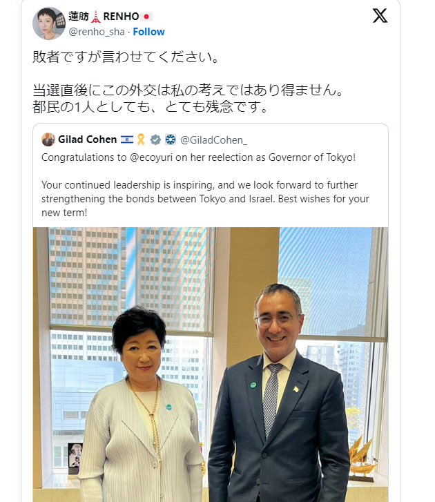 イスラエル大使が小池都知事との2年前の写真をアップして当選祝いのメッセージ。