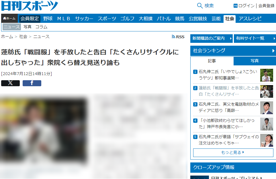 https://www.nikkansports.com/general/nikkan/news/202407120000471.html「おはよう」とつぶやいた上で「私にとっては神聖な戦闘服?白いジャケット、たくさんリサイクルに出しちゃった。さあ、すっきり」とポストした。カジュアルな長袖シャツとデニム、サンダル姿でくつろいだ様子のモノクロ写真も投稿し、これまでの蓮舫氏のイメージと違った、柔らかな雰囲気をにじませた。
