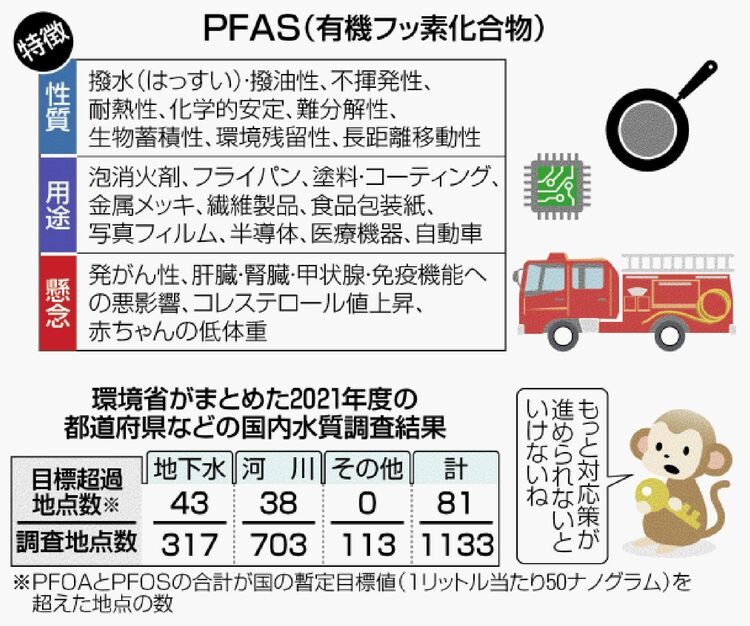 食品衛生法上の基準はないが、水道法の暫定目標値(1リットルあたり50ナノグラム)の最大約6倍に相当する濃度。市の要請を受けて企業側が対応し、現在は目標値以下に収まっているという