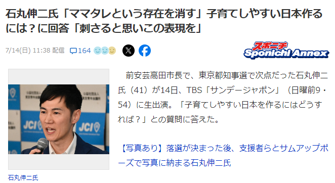 前安芸高田市長で、東京都知事選で次点だった石丸伸二氏(41)が14日、TBS「サンデージャポン」(日曜前9・54)に生出演。「子育てしやすい日本を作るにはどうすれば?」との質問に答えた。この日は大沢あかね、peco、鈴木紗理奈らママタレがゲスト出演。大沢は石丸氏に「子育てしやすい日本を作るにはどうすれば?」と質問した。