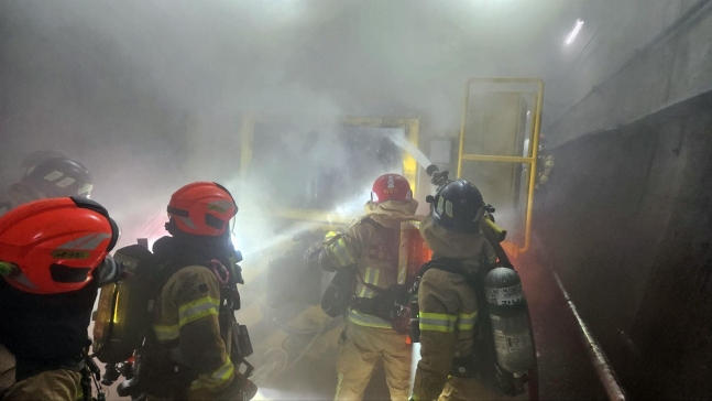 7月1日未明、ソウル地下鉄3号線で火災を起こしたモーターカーを水西車両基地へと牽引する消防隊員ら。その後の捜査で火災を起こしたモーターカーにはリチウムイオン電池が積載されていることが判明した。