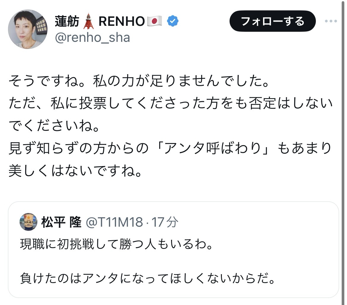 【悲報】蓮舫マジでヤバい、朝五時に起きて深夜0時すぎてもレスバトルしてる
