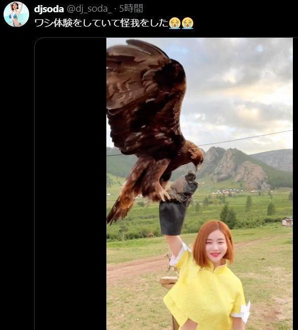 2024.07.16(Tue) デイリースポーツ韓国出身のDJ SODAが16日、自身のXを更新。滞在先のモンゴルでの一コマとして「ワシ体験をしていて怪我をした」と日本語で報告した。